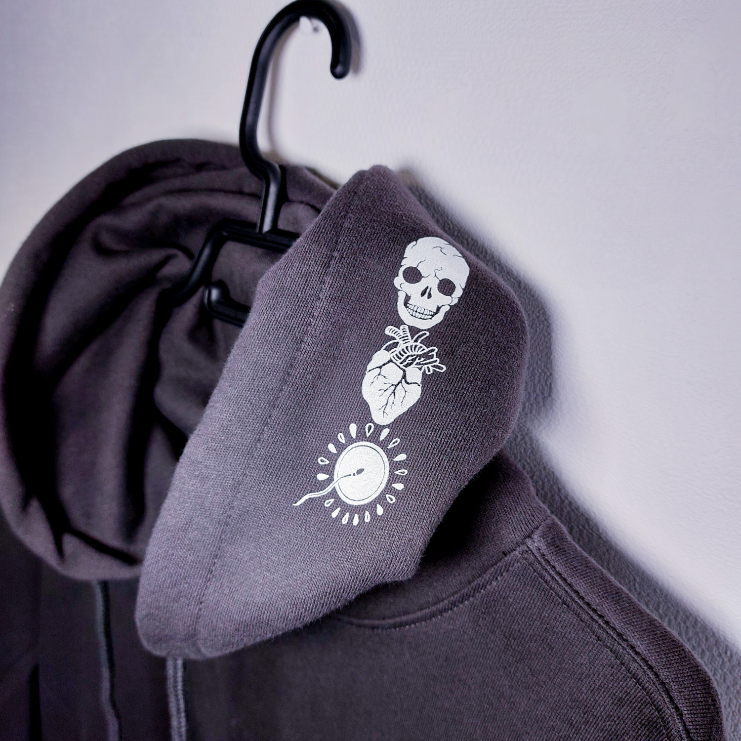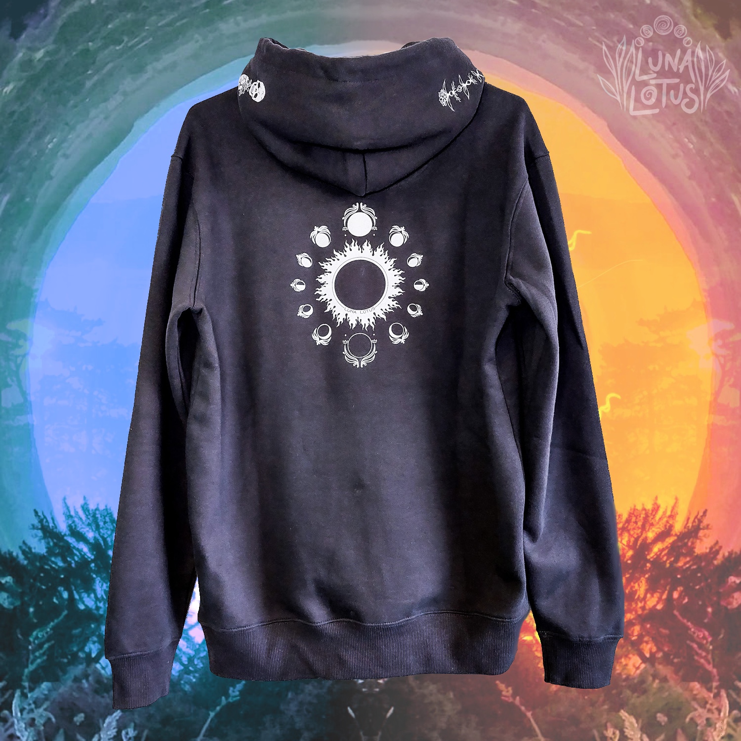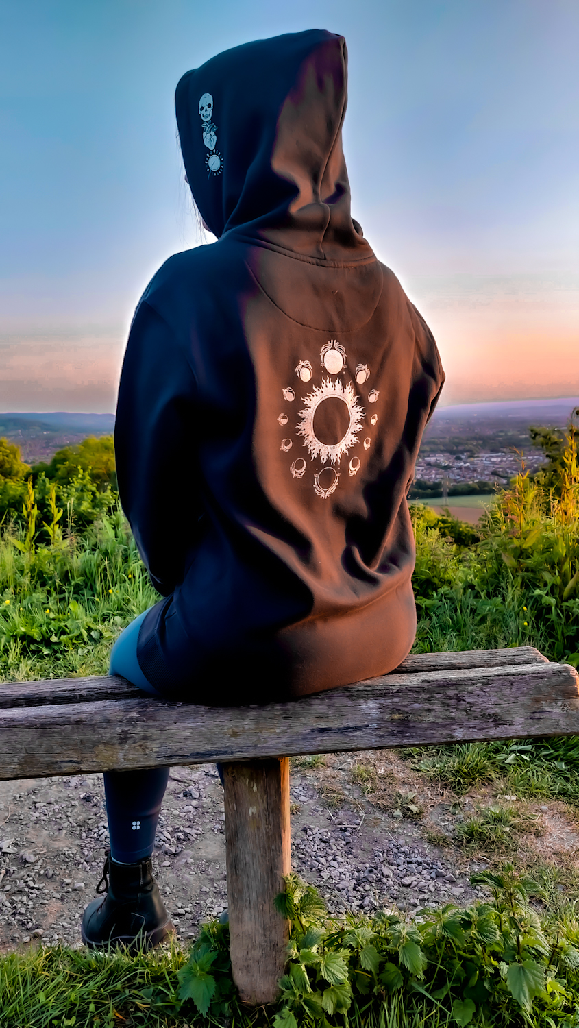 Introducing the Dusk to Dawn hoodie! Cosy up next to the campfire or keep the party going from dusk to dawn in this super soft and cosy hoodie. Featuring four ultra detailed prints that represent the cycles of animal and plant life along with the lunar and solar cycles. The fabric colour is ‘Ash Black’ – a softer, very flattering black.